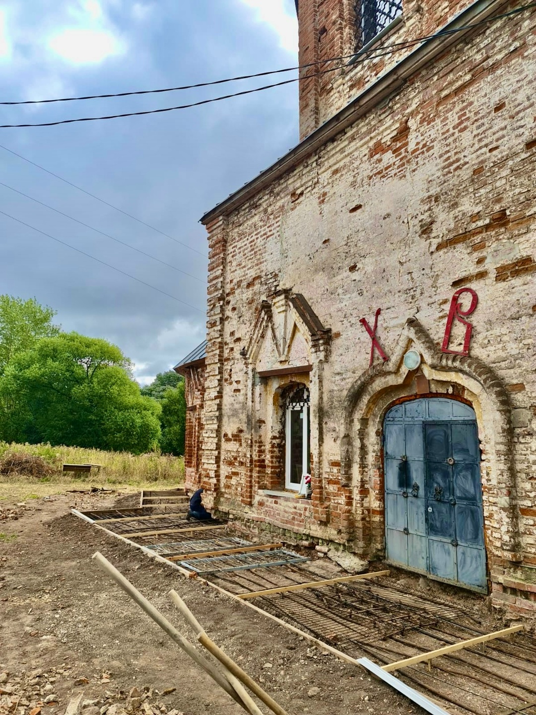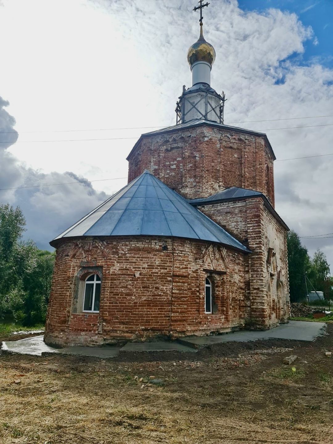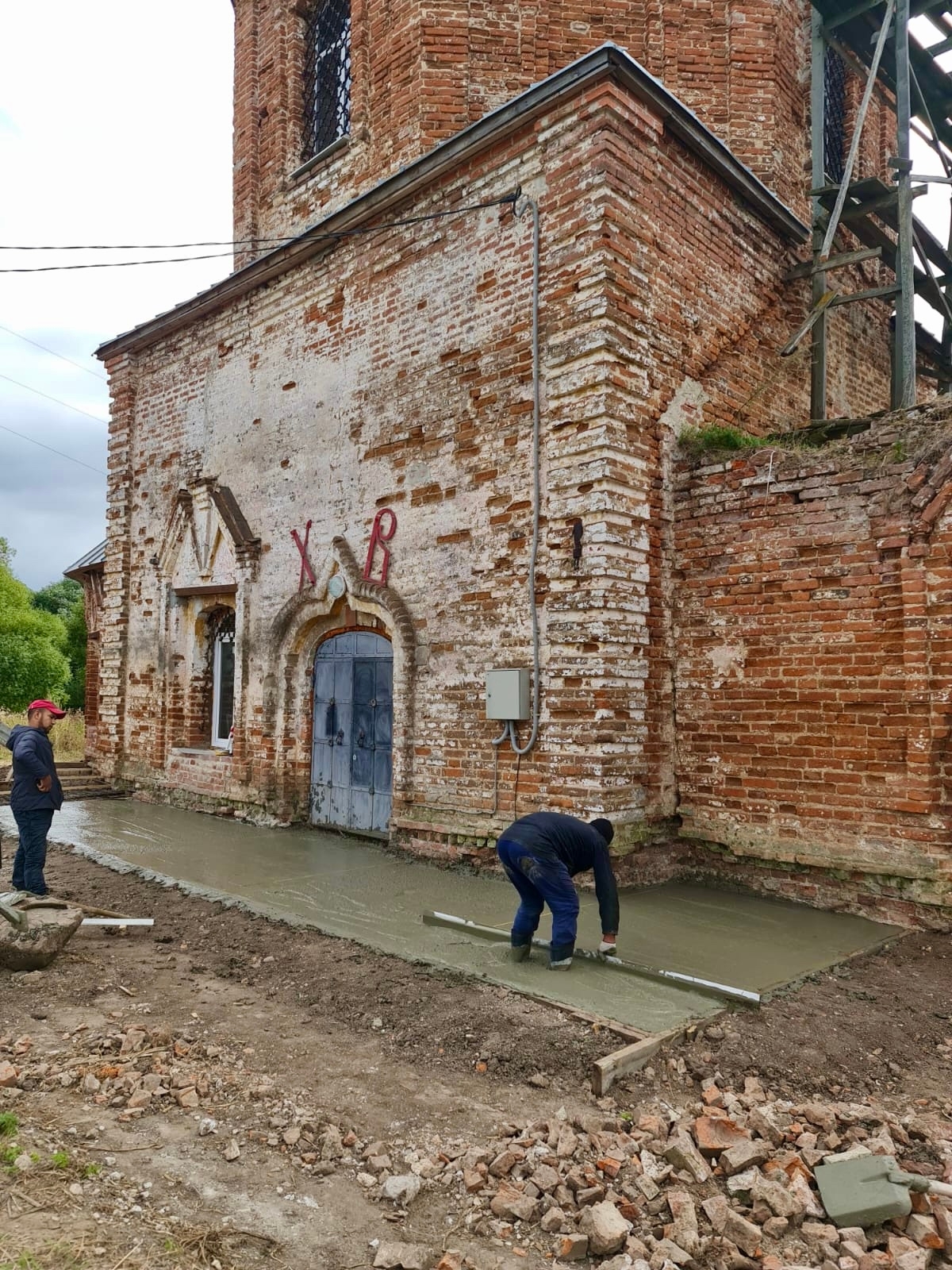На фото — ещё один важный шаг: у стен храма сделана новая отмостка, чтобы защитить фундамент и кирпичную кладку от влаги и дальнейшего разрушения.