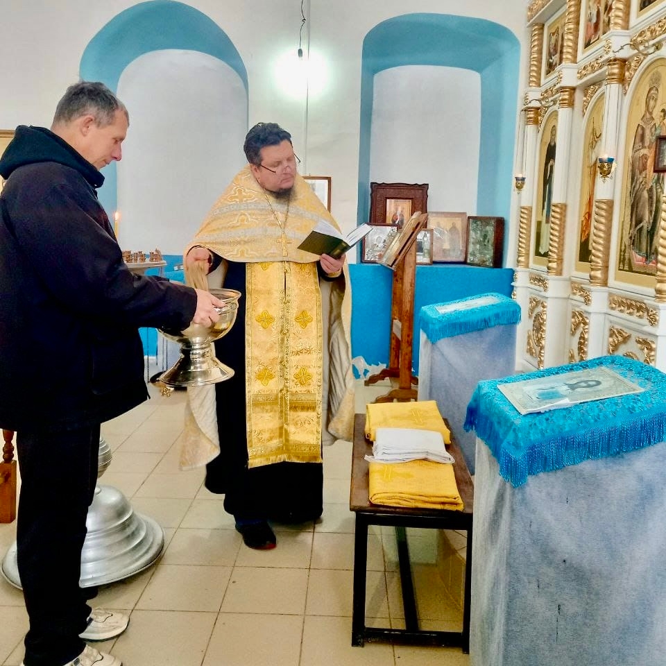 Освящение отцом Павлом облачения для престола Никольского храм в храме Успения Богородицы в селе Глазово