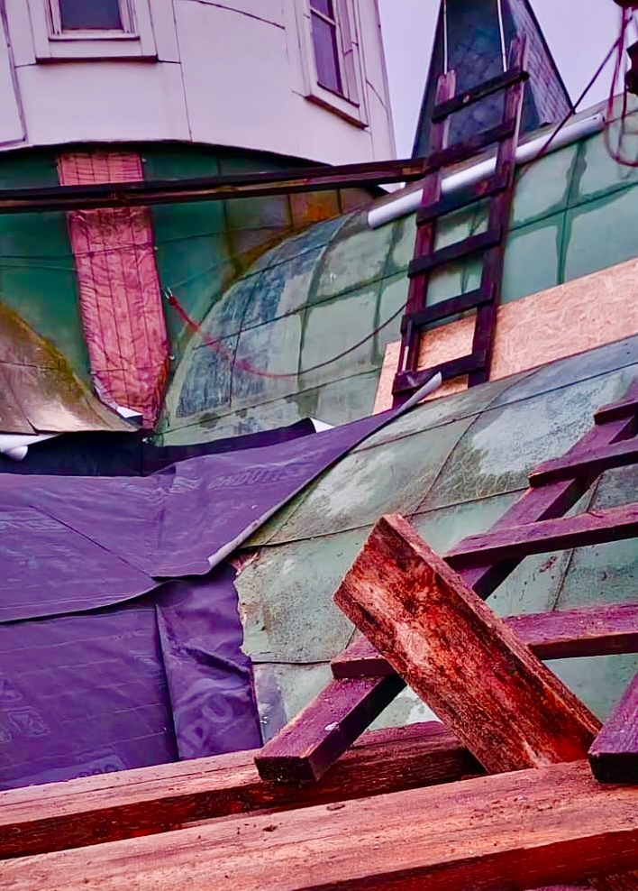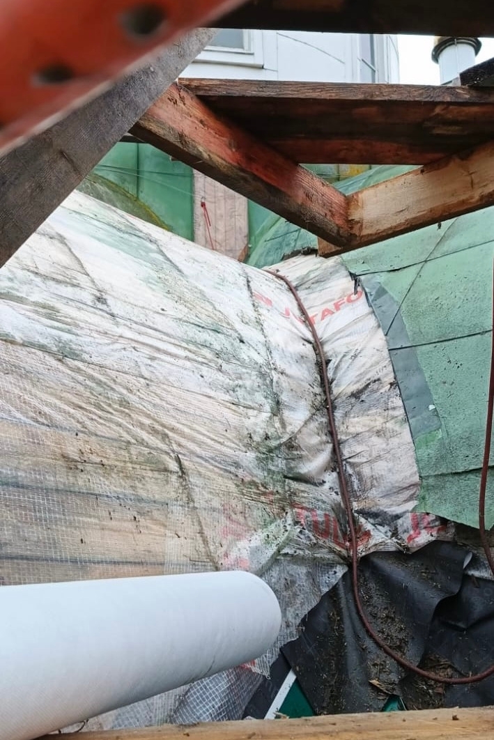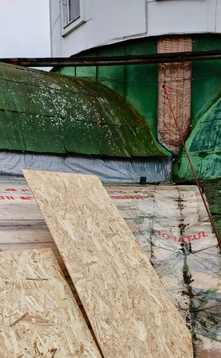 Делимся с вами этапами работ. На фото хорошо видно, каким было старое покрытие под металлом и почему вода годами просачивалась внутрь: она портила стены, своды и потолок храма, разрушая святыню изнутри.